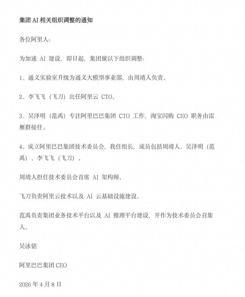 DoNews4月8日音书赌钱赚钱app,4月8日,阿里巴巴集团CEO吴泳铭发布全员信,集团AI相干迎来组织大转念。包括新开导集团技能委员会,通义践诺室升级为奇迹部等。